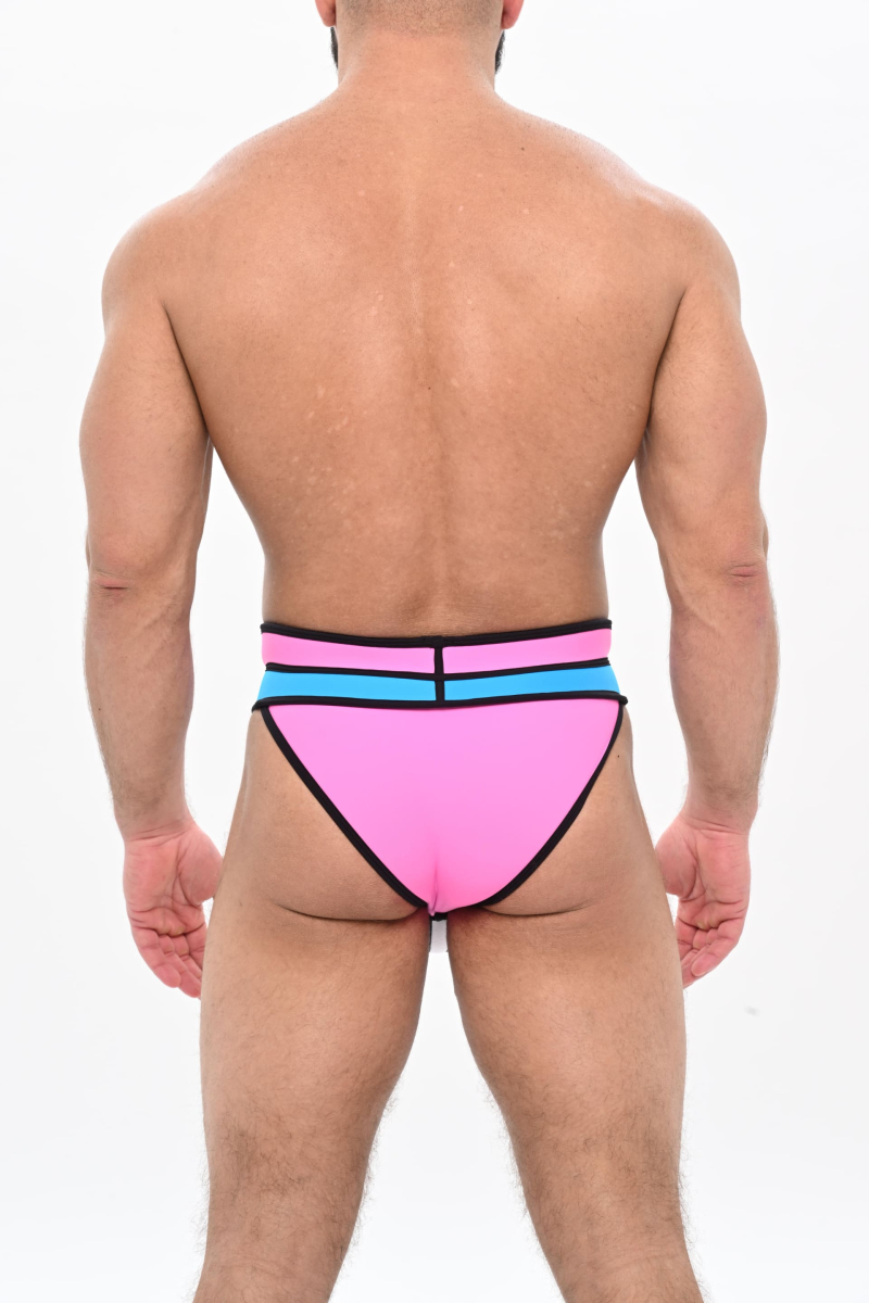 Slip en néoprène et lycra avec des ailes latérales qui entourent les hanches, partant du dos et plongeant vers l'avant.