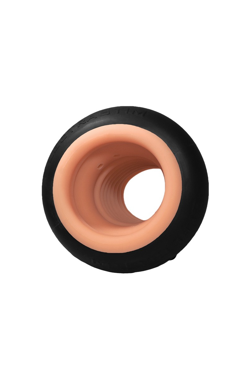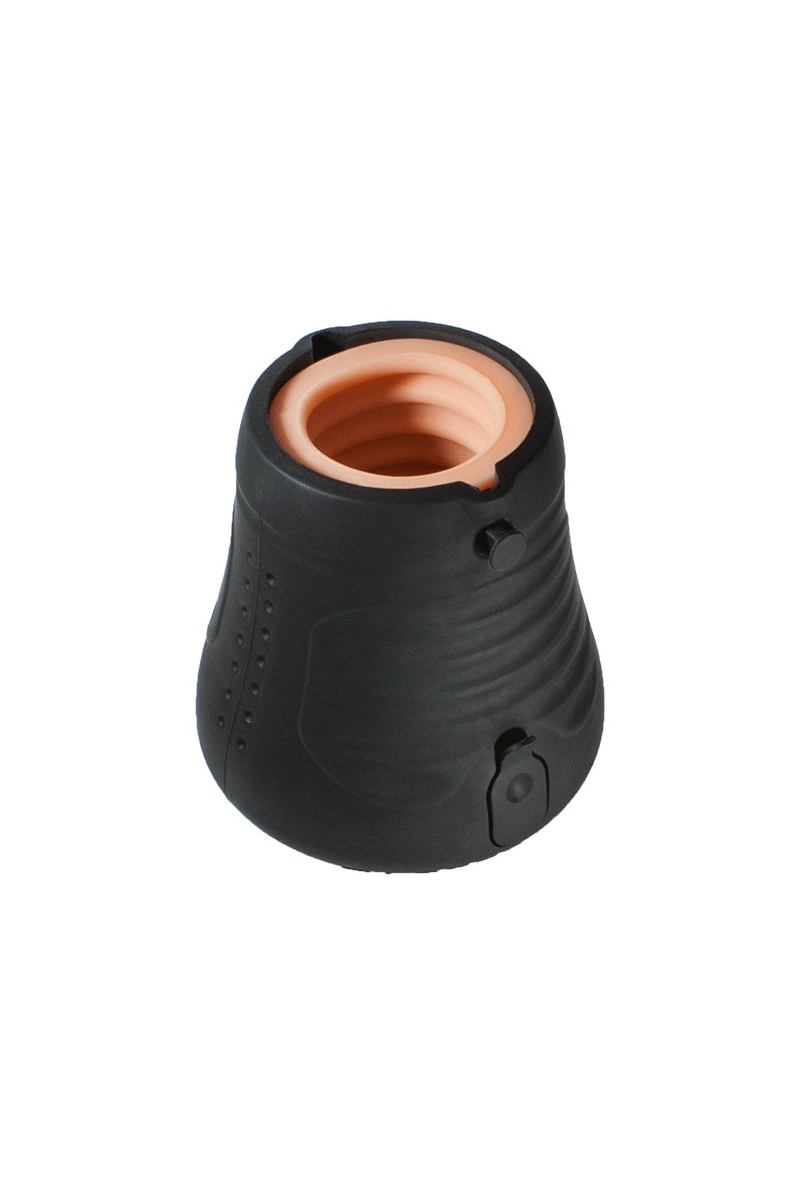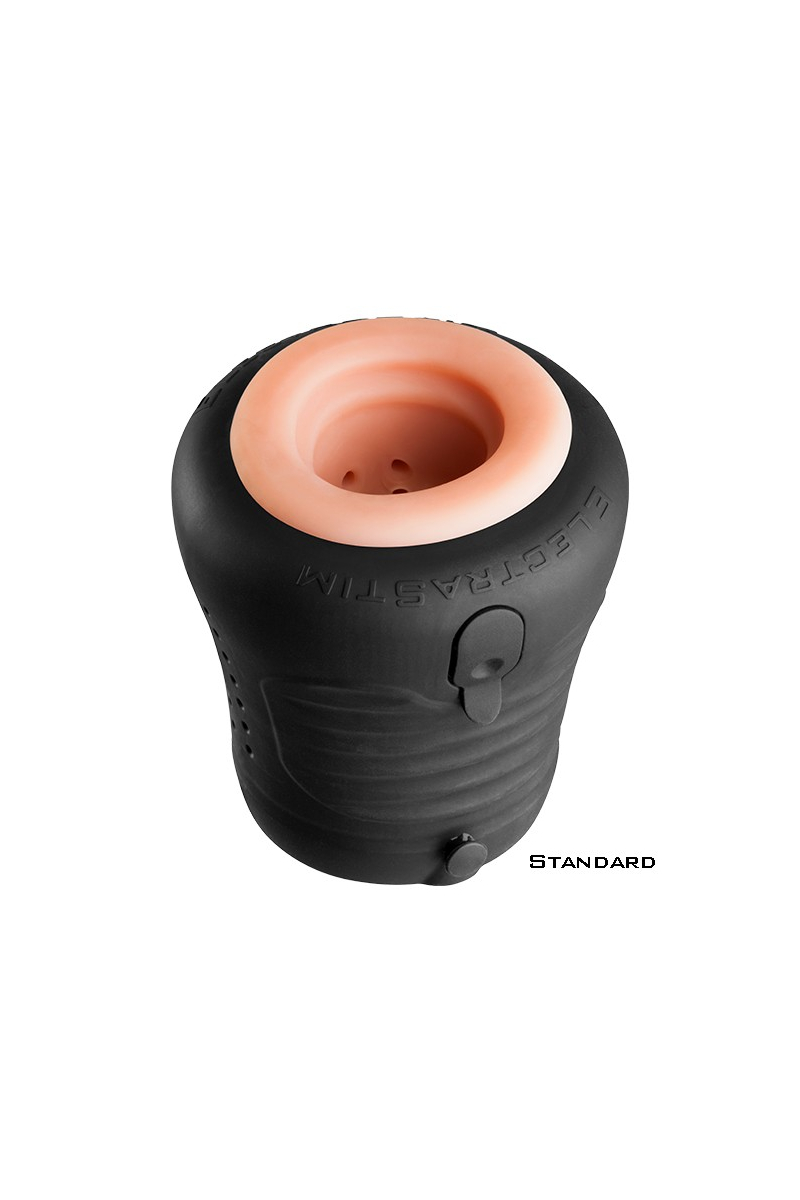 Masturbateur masculin conçu pour l’électrostimulation, avec gaine interne texturée, étui flexible compressible et connectique 2 mm pour boitier externe.