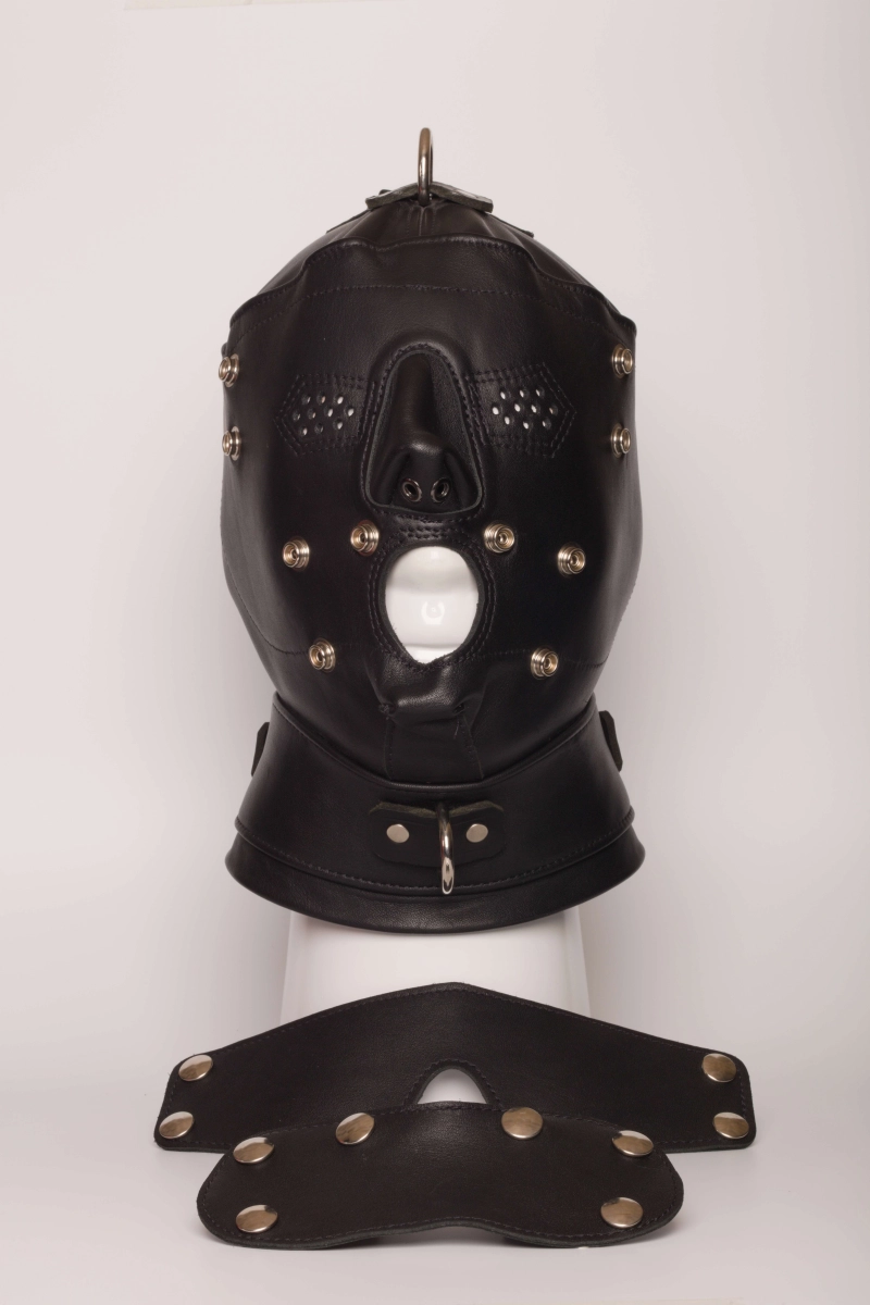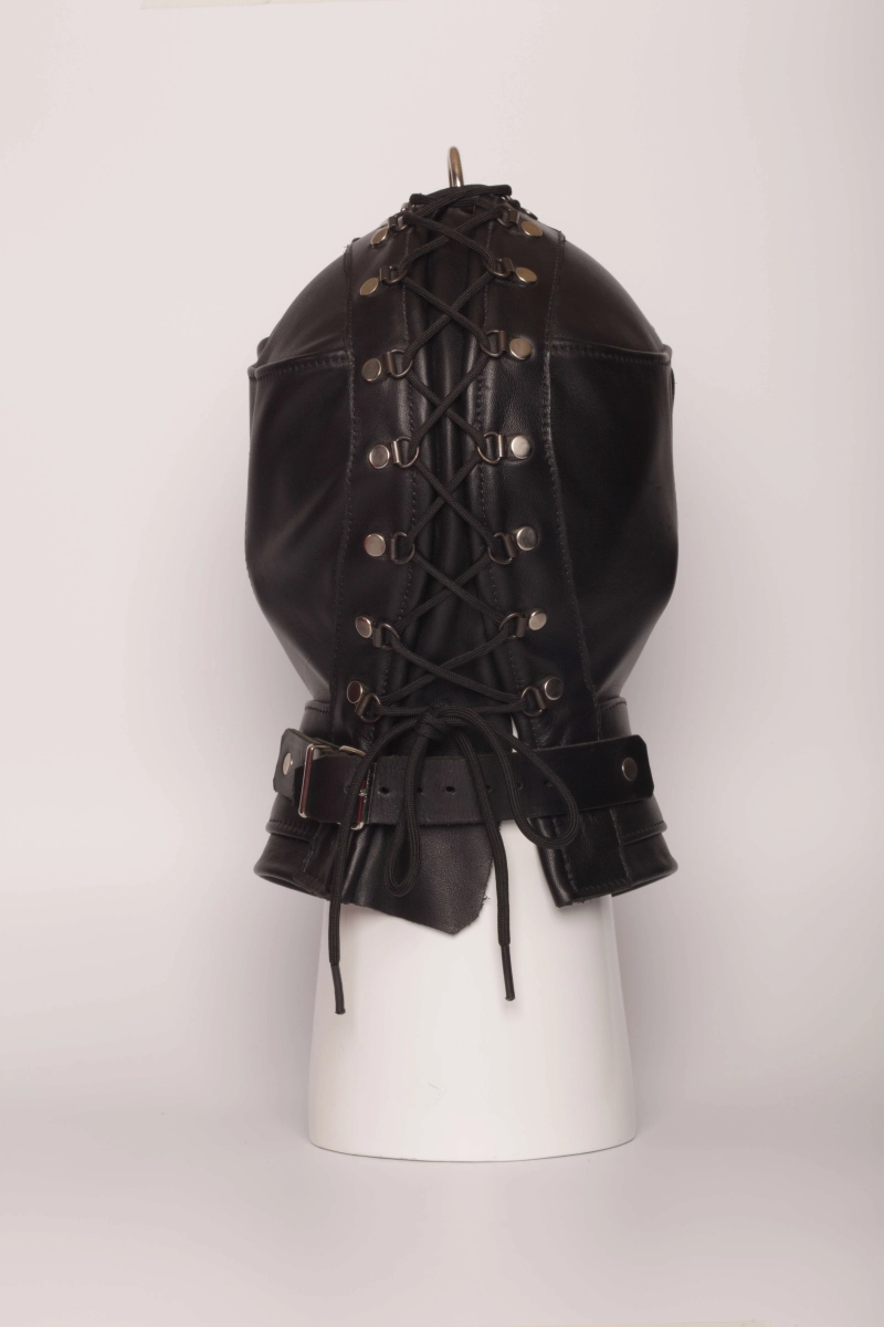 Cagoule en cuir noir à l’apparence de casque, offrant une tenue solide et un contact doux au toucher. La face avant est constituée d’une double épaisseur de cuir, procurant un maintien ferme et une esthétique puissante. Fermeture à lacets à l’arrière, collier semi-rigide intégré avec boucle métallique et anneau D-ring à la base du cou.