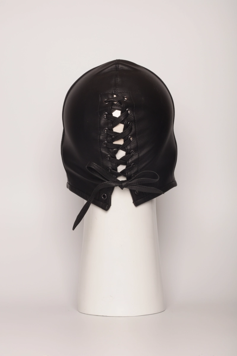 Cagoule de bourreau en cuir pleine fleur noir avec liseré noir, fabriquée à la main dans les ateliers IEM du sud de la France par notre couturière. Fermeture à lacets. Tailles M, L ou XL.