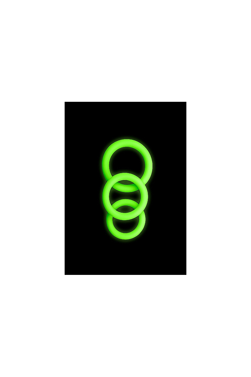 Set de trois cockrings phosphorescents en silicone souple et extensible. Trois tailles pour varier les sensations, brillent dans le noir après exposition à la lumière.
