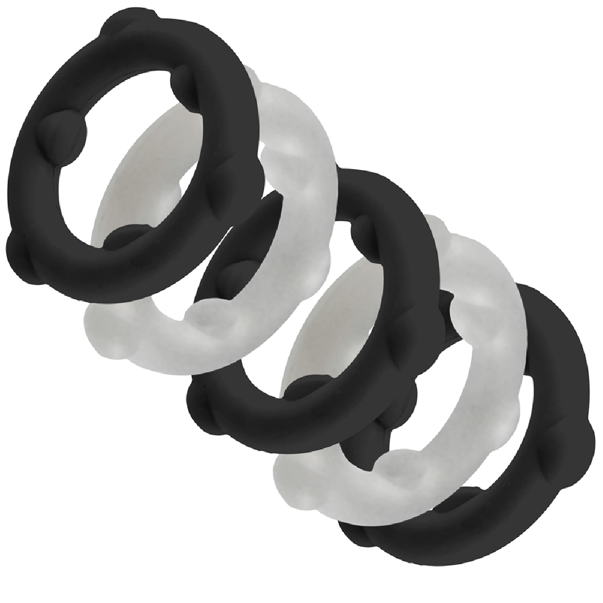 Découvrez le set de 5 cockrings GEARHEADS en silicone liquide, comprenant 3 anneaux noirs et 2 anneaux transparents, conçu pour des sessions de jeu prolongées avec confort et résistance.