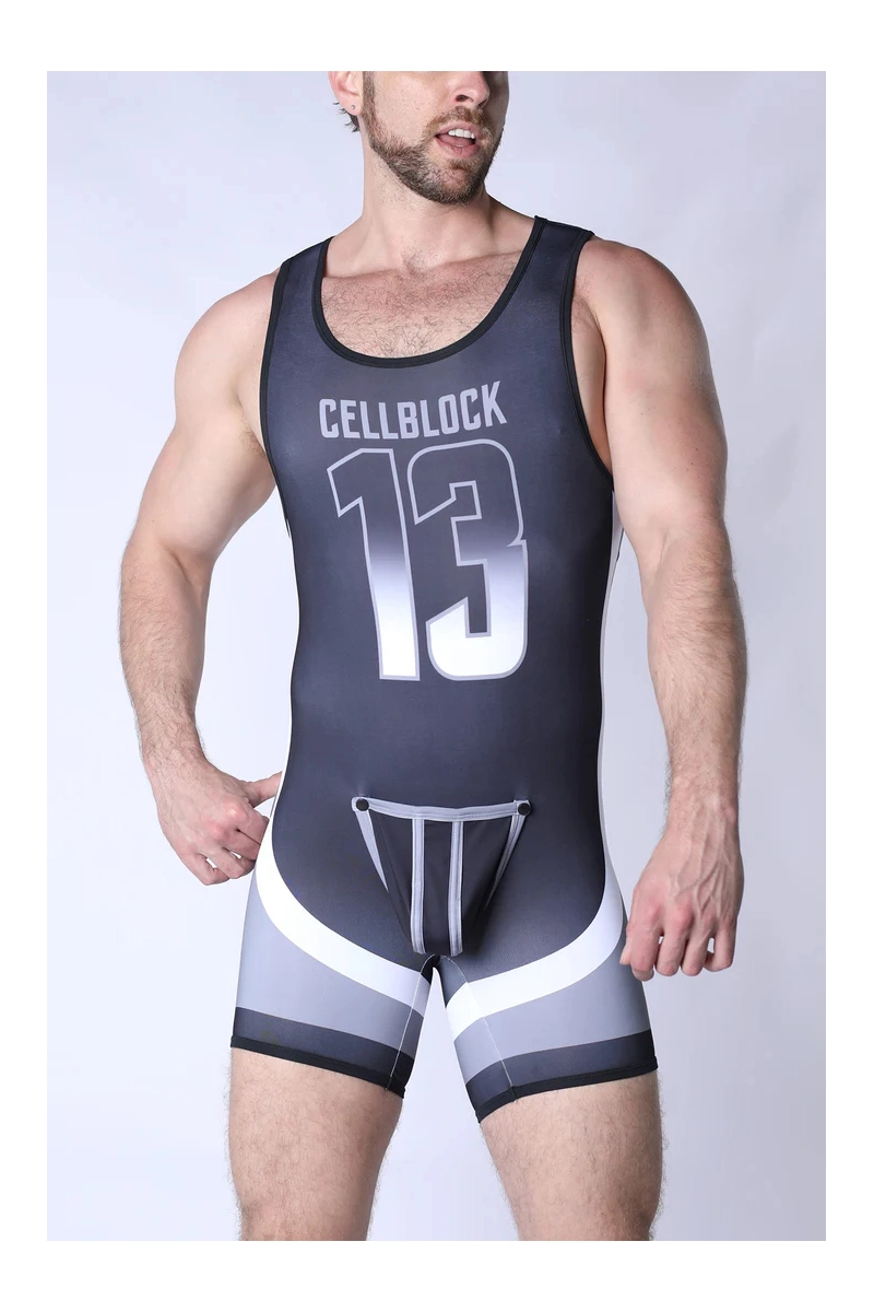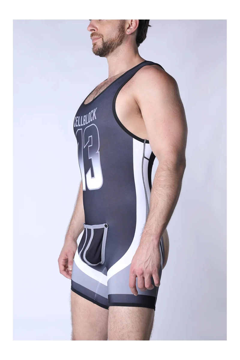 Combinaison graphique à dos ouvert en polyester extensible. Poche frontale amovible, coupe ajustée. Design signé CellBlock13.