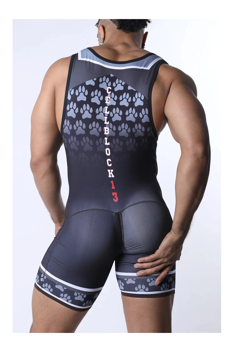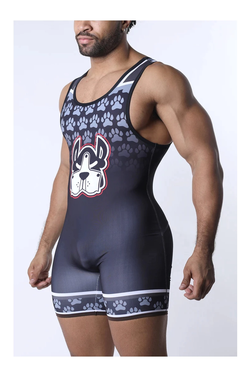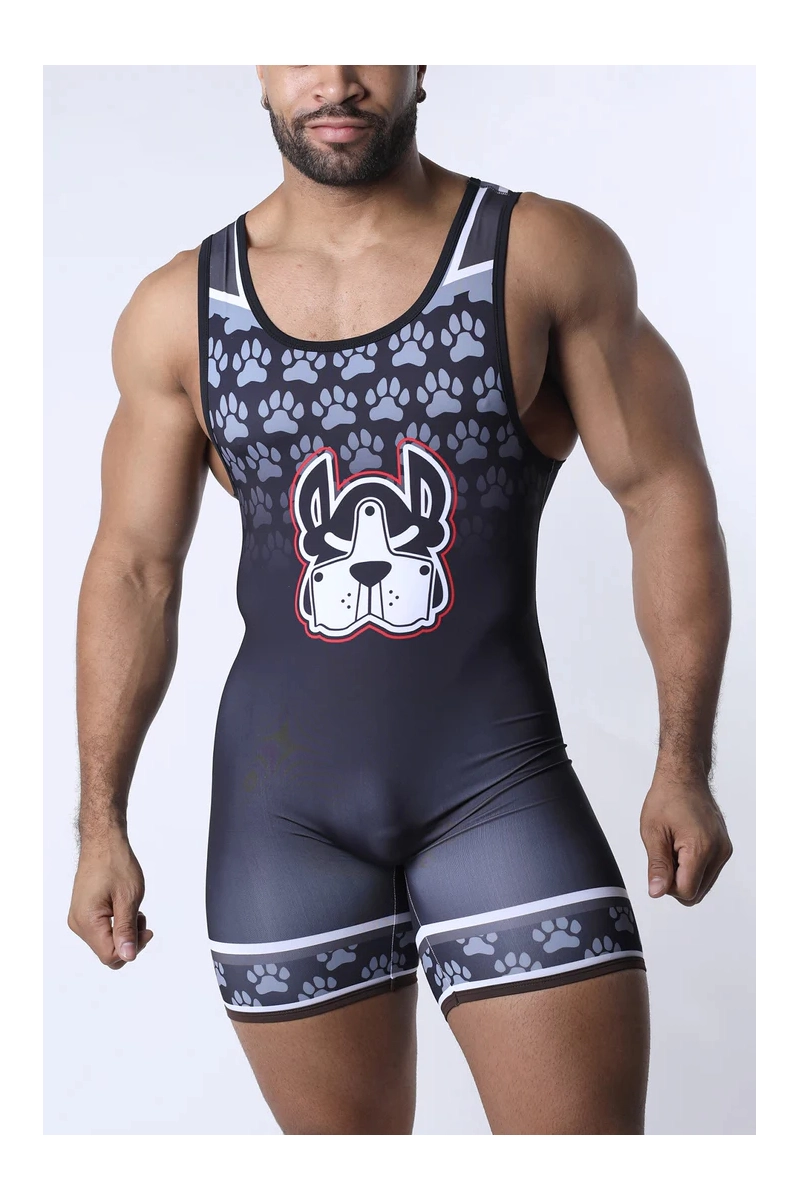 Combinaison moulante zippée dans le dos, conçue pour le pup play. Matière extensible, graphismes fétiches et ouverture intégrale à l'arrière.