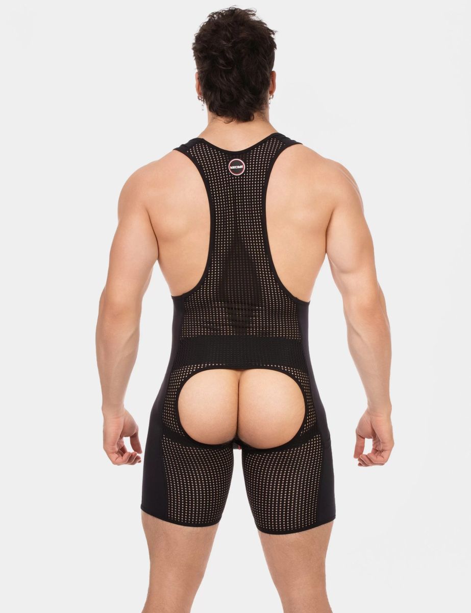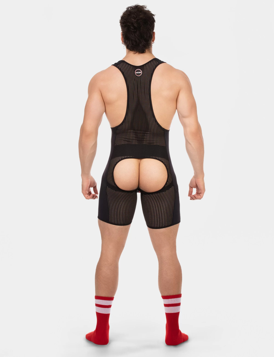 Combi chaps noire avec bandes diagonales rouges. Coupe ajustée, structure respirante et design athlétique qui met en valeur la silhouette.