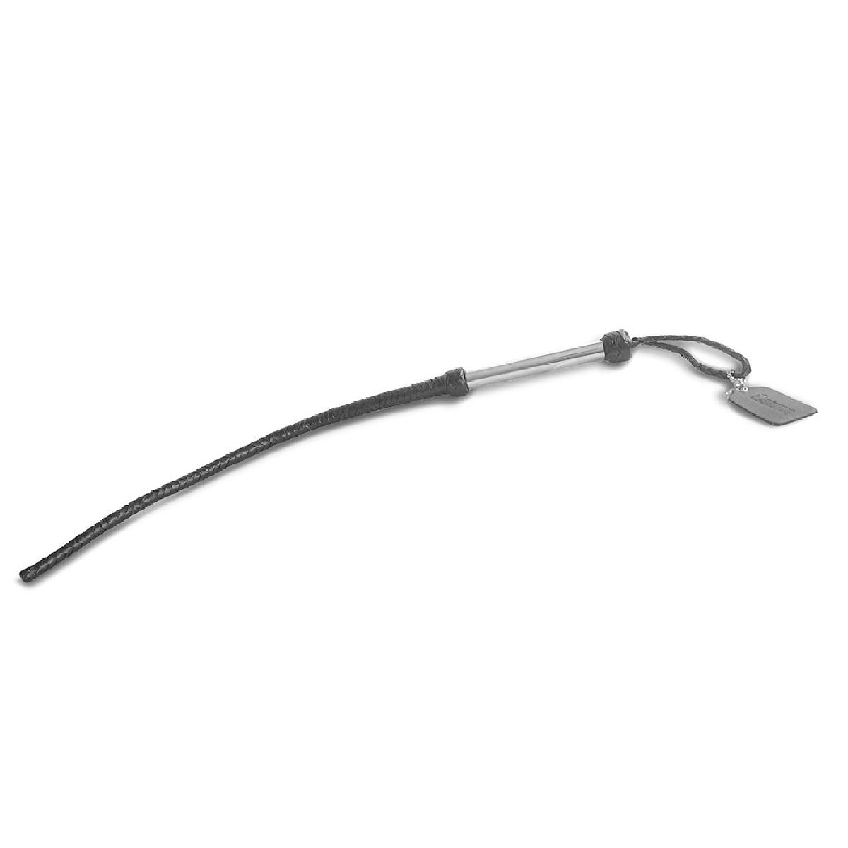 Cravache en cuir tressé avec manche en acier inoxydable. Conception équilibrée avec finitions décoratives.