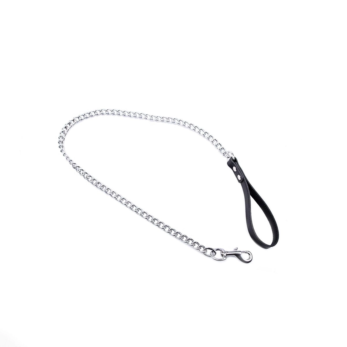 Laisse noire en cuir, avec mousqueton pivotant. Longueur totale 105 cm, chaîne de 85 cm. Accessoire sobre et fonctionnel pour jeu de rôle et de contrôle.