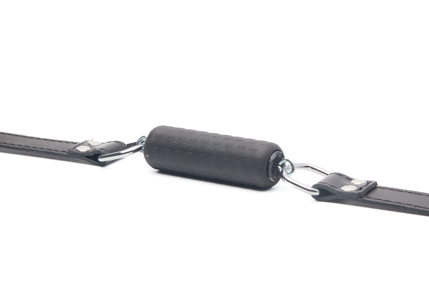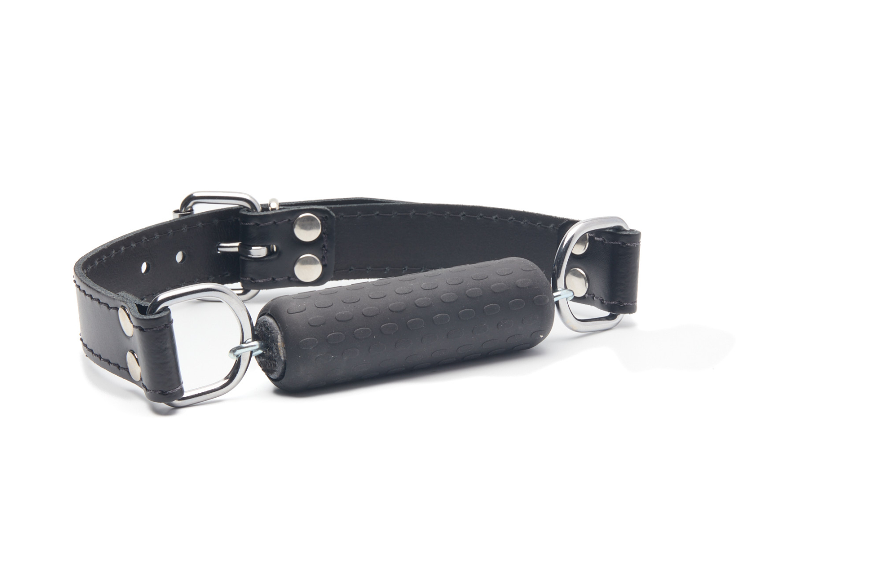 Bâillon en cuir, réglable, avec un mors en latex.