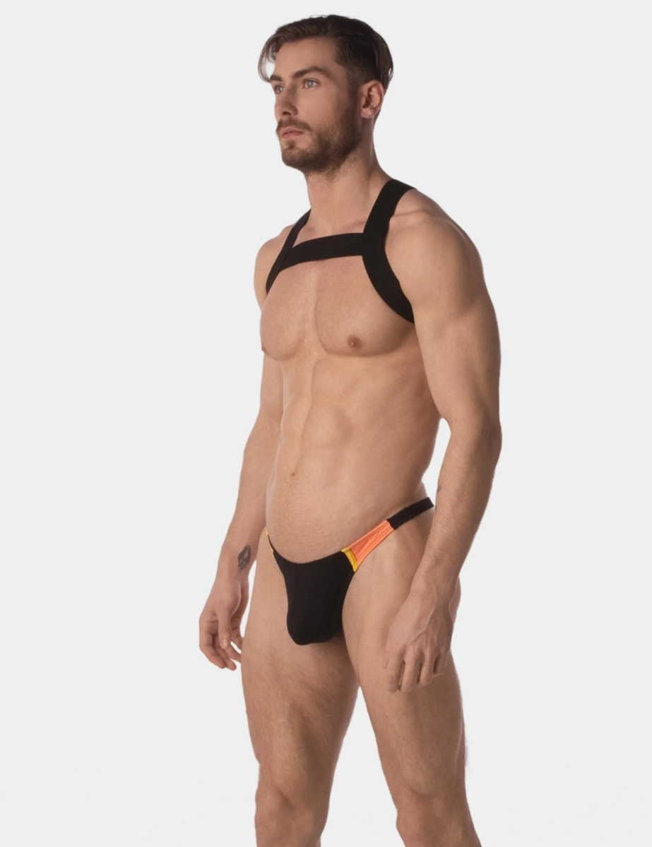 Le harnais Matt met en valeur le haut du corps avec un design sobre et efficace. Confectionné dans une sangle élastique solide, il se compose de deux bretelles verticales reliées par une bande horizontale sur la poitrine, formant un cadre carré qui dégage les pectoraux. Léger et ajusté, il offre un maintien confortable tout en accentuant les lignes du torse.