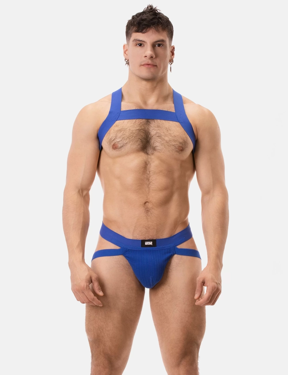 Jockstrap bleu à coupe sportive, poche côtelée douce et maintien ajusté. Ceinture élastique résistante et sangles arrière pour un effet liftant naturel.
