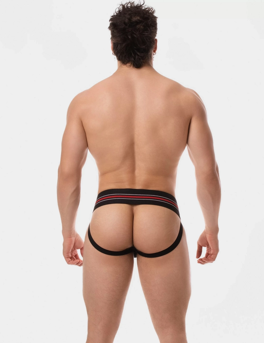 Jockstrap noir à coupe sportive avec poche côtelée douce, ceinture élastique résistante et logo centré. Confort durable et maintien précis.