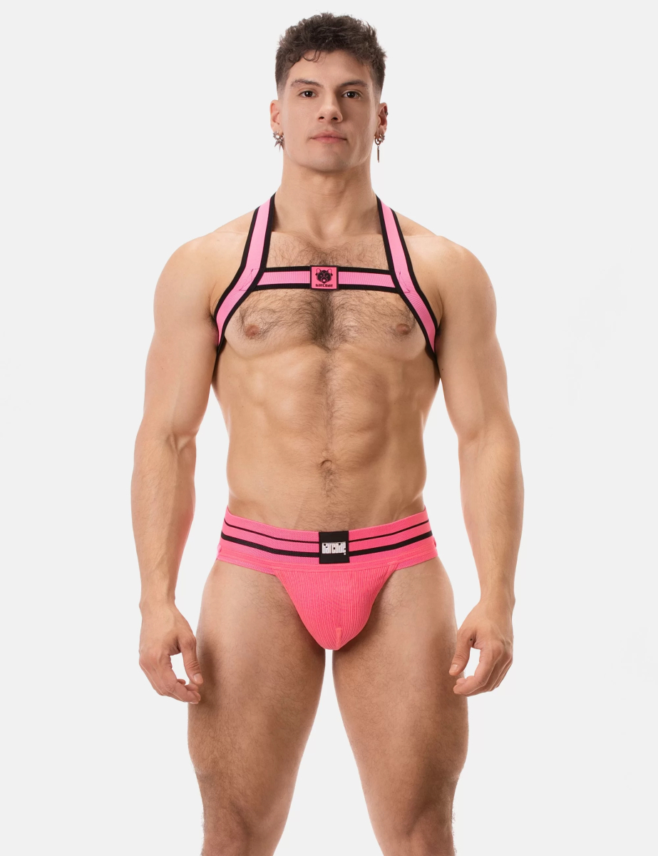 Jockstrap rose en coton doux avec ceinture élastique résistante et lanières noires contrastées. Coupe sportive, maintien précis et confort respirant.