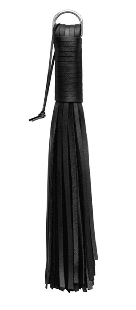 Martinet compact en similicuir noir, 50 lanières souples. Prise en main stable pour jeux de caresses ou de punition.