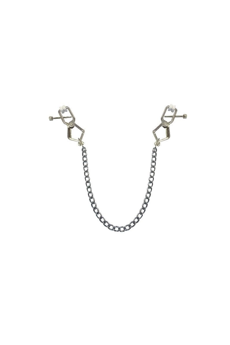 Pinces à seins en métal de type alligator, reliées par une chaîne argentée. Pression réglable grâce à une vis de serrage pour un maintien précis et modulable. Adaptées aussi bien aux débutants qu’aux utilisateurs expérimentés pour un jeu sensoriel contrôlé.