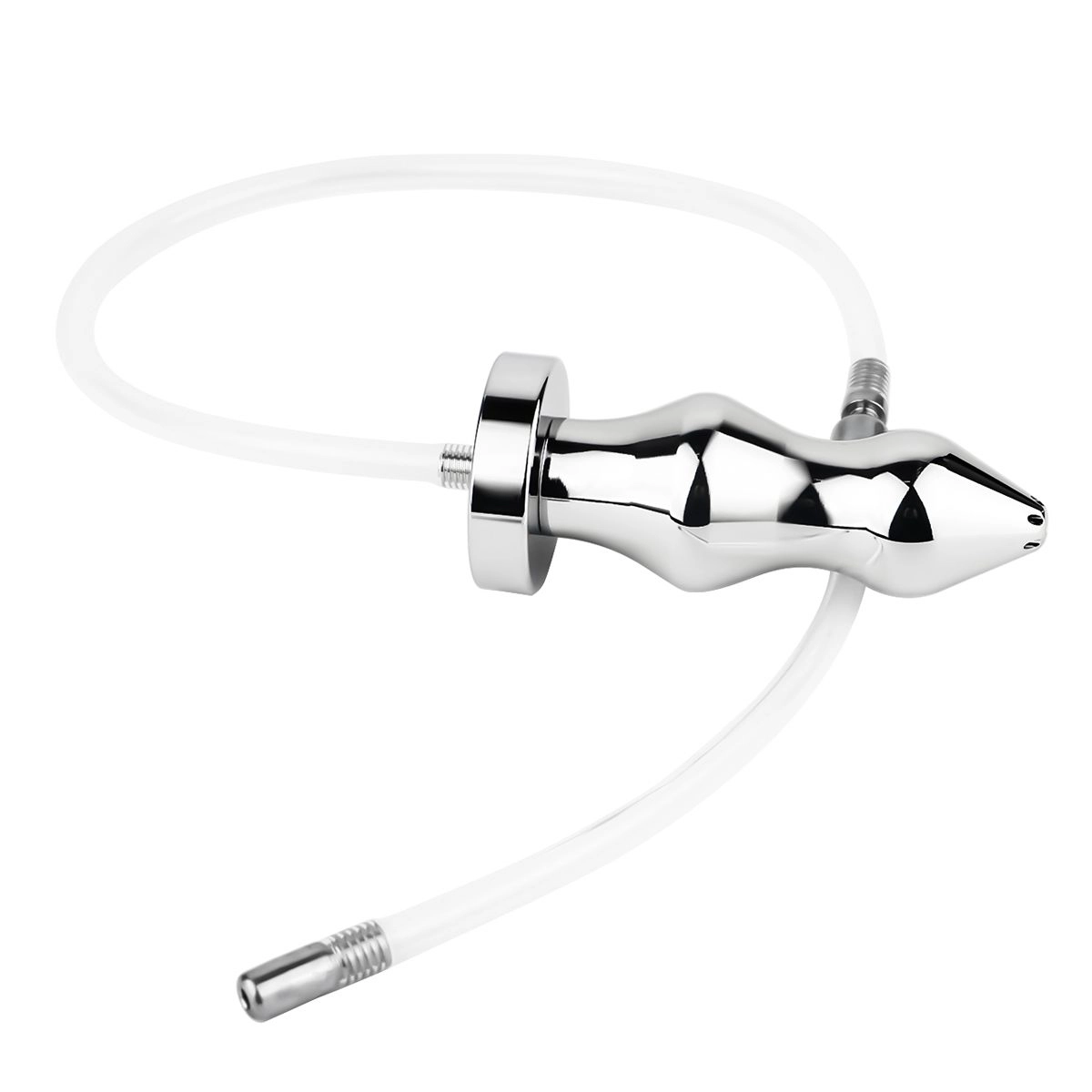 Plug en acier poli avec sonde urétrale flexible en silicone. Structure courbée et profil perlé assurant une insertion confortable et un maintien stable.
