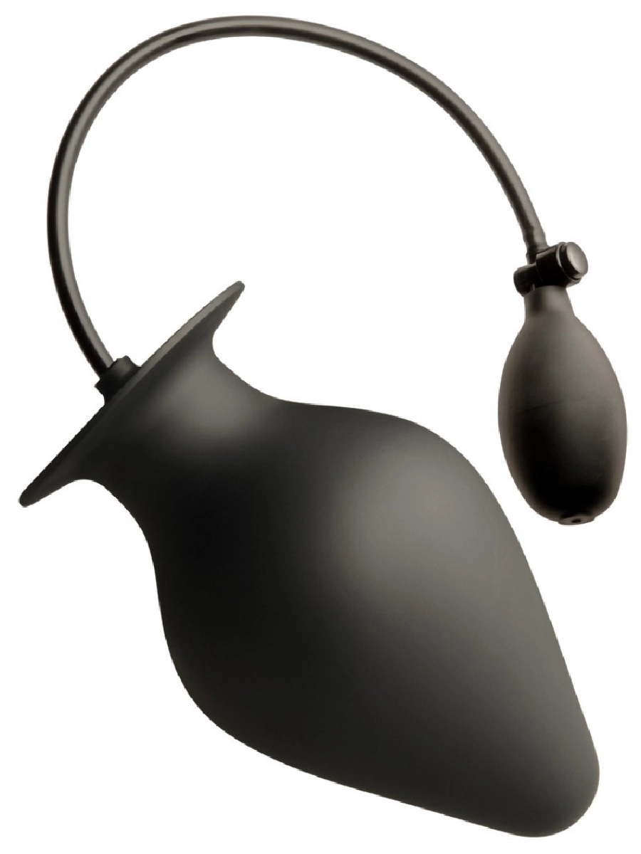 Plug anal gonflable en silicone noir, forme conique, avec pompe manuelle et valve de dégonflage rapide.