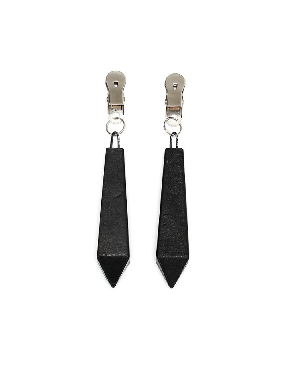 Paire de pinces à seins en métal avec mâchoires dentées et poids losange recouvert de cuir, 300 g chacune. Vendues par paire.