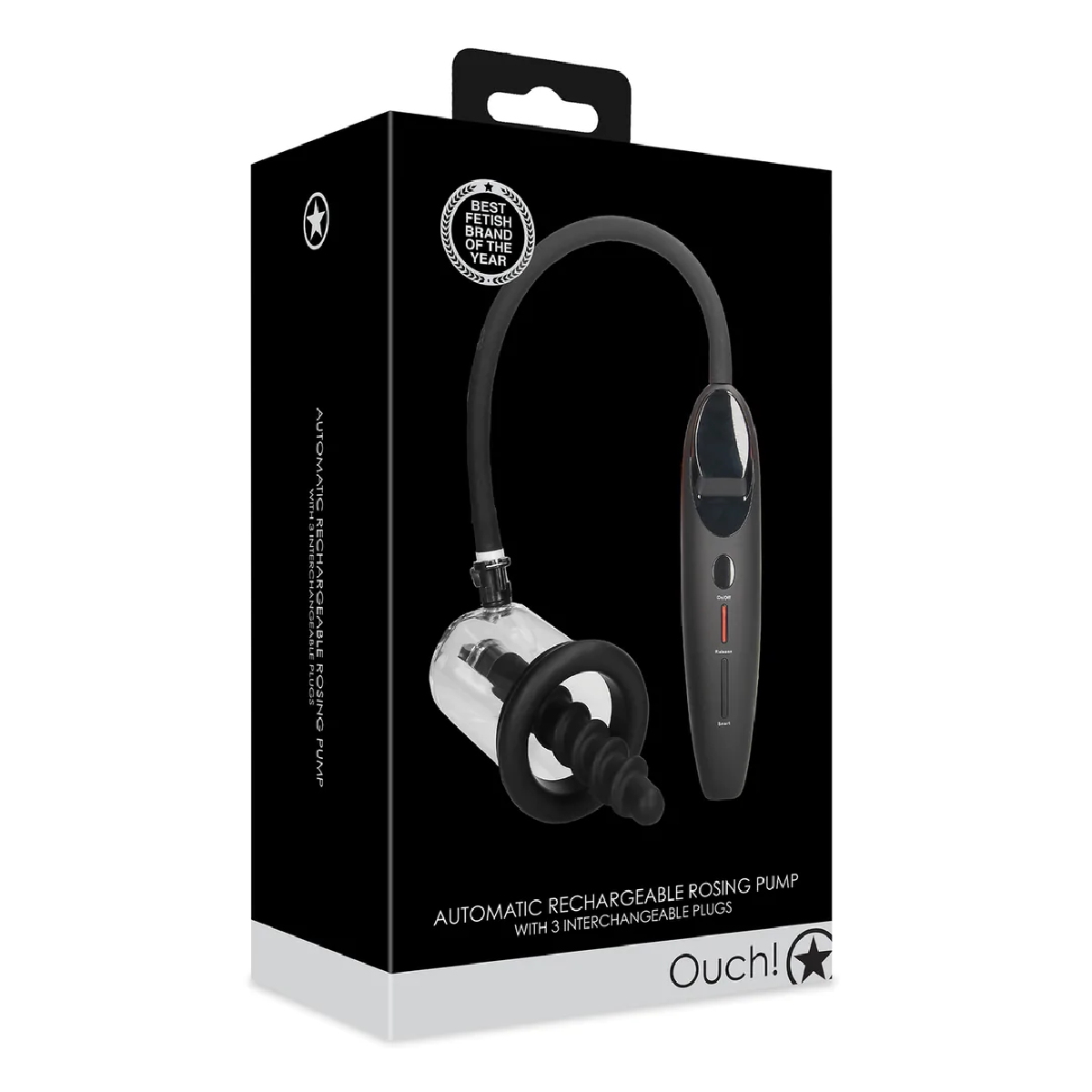 Pompe anale automatique rechargeable avec effet de succion renforcé. Livrée avec 3 plugs. Pour un plaisir intense et un rendu visuel percutant.