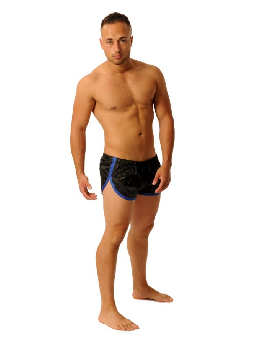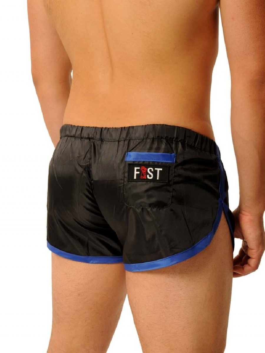 Short léger coupe vintage en polyester résistant, avec ceinture élastique, cordon de serrage et poche arrière siglée Fist. Bordure bleue.