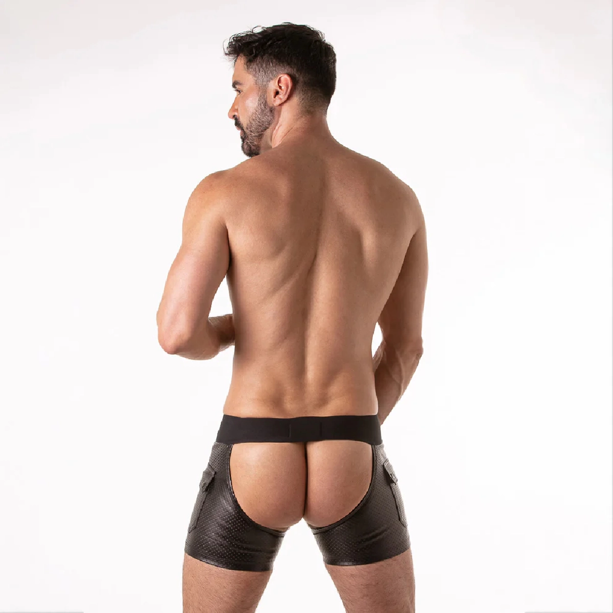 Short chaps Rub It en faux cuir perforé respirant, conçu pour un style affirmé et fonctionnel. Il combine poches cargo, boucle interne pour harnais et ceinture élastique large pour un maintien optimal.