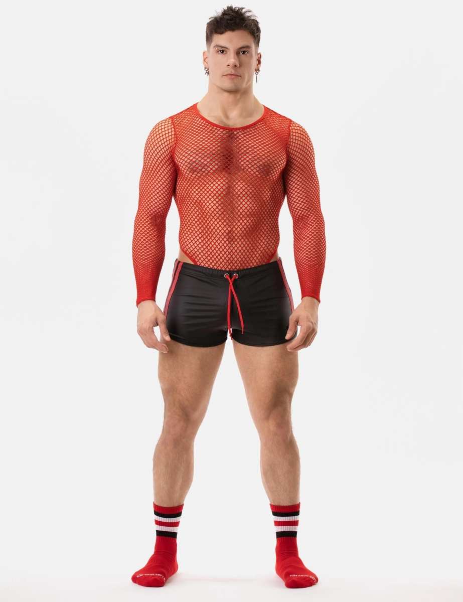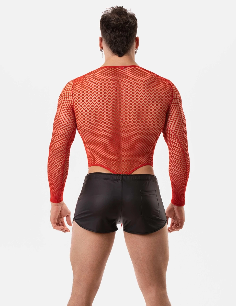 Short noir effet cuir, avec cordons de contraste et bandes latérales. Coupe ajustée, matière souple et finition soignée.