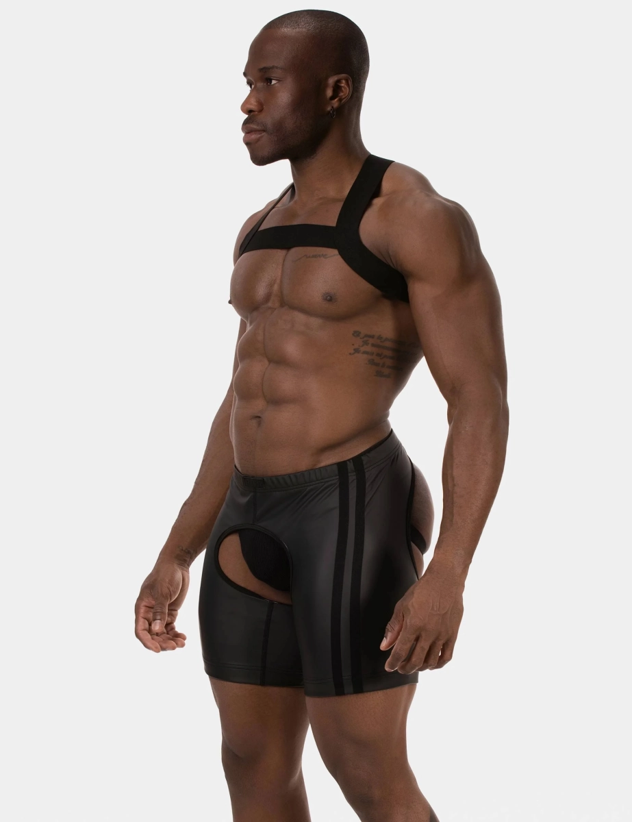 Un short chaps au design ouvert à l’arrière qui associe une esthétique affirmée à une coupe ajustée. Sa matière extensible effet cuir épouse la silhouette tout en offrant confort et liberté de mouvement. Une pièce pensée pour un style audacieux et une mise en valeur naturelle du corps.