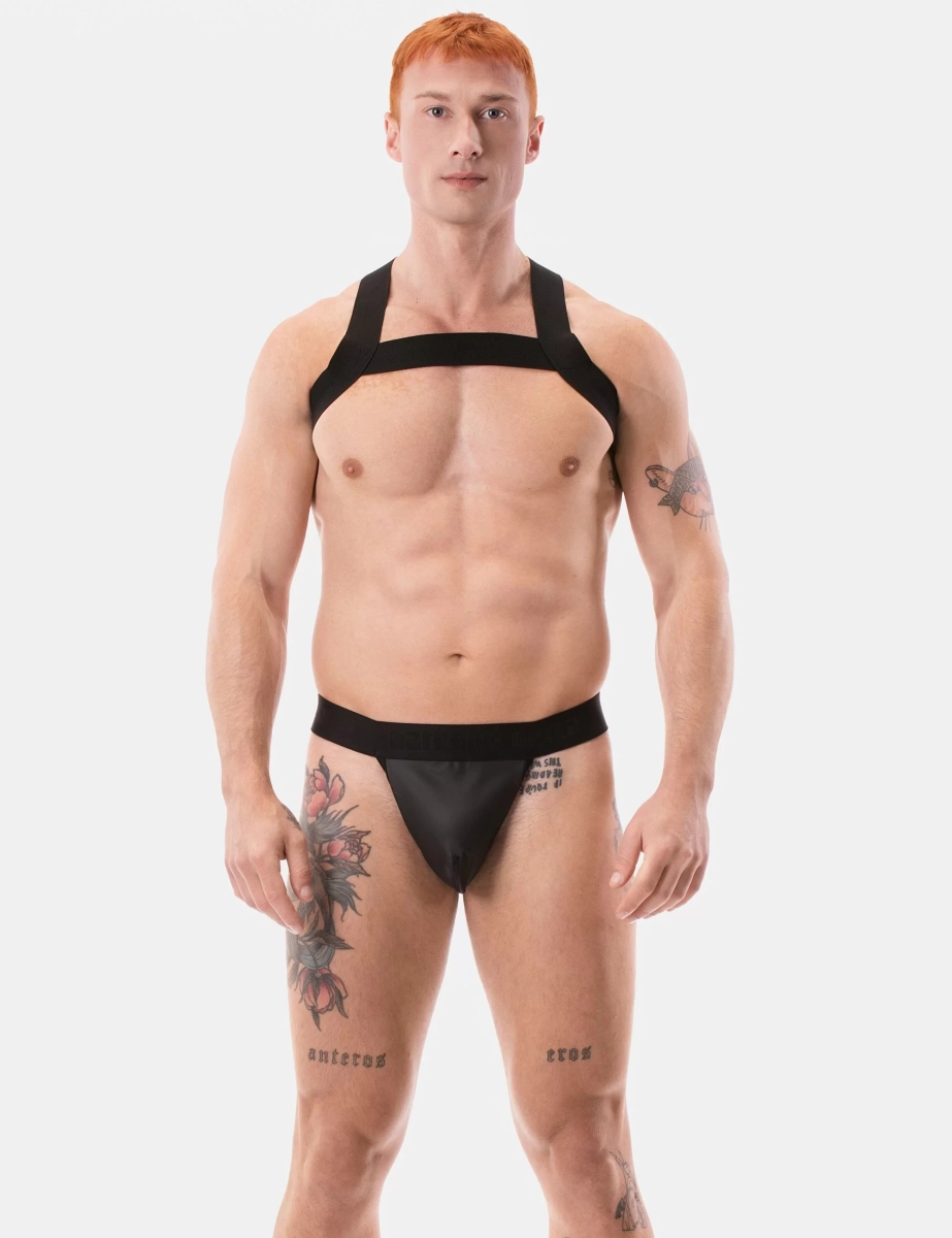 String noir effet cuir avec double lanière arrière et poche avant structurée. Coupe ajustée et matière souple pour un maintien précis et confortable.