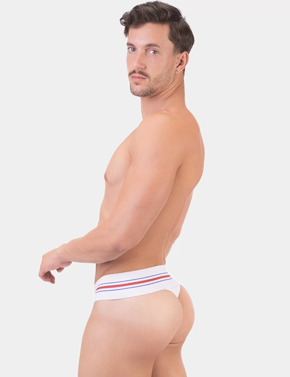 String blanc avec large ceinture élastique tissée et logo intégré. Poche douce en coton pour un maintien sûr et un confort naturel.
